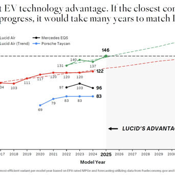 如今他又拿出了一张表,对比了自家的Lucid Air和特斯拉Model S、保时捷Taycan以及奔驰EQS的能耗,得出结论就是自己的Air遥遥领先,而且对手们未来十年都不一定赶得上。